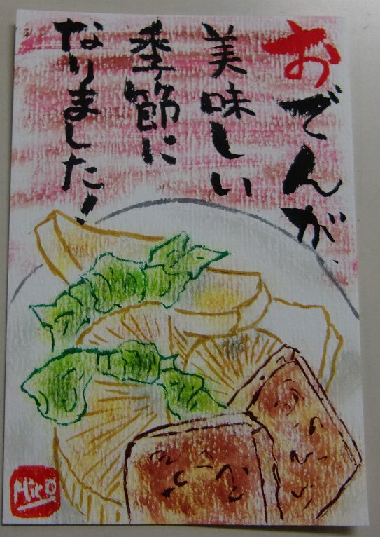 絵に力が、入りすぎて文字が書けなくなったので 別な葉書に書きました。