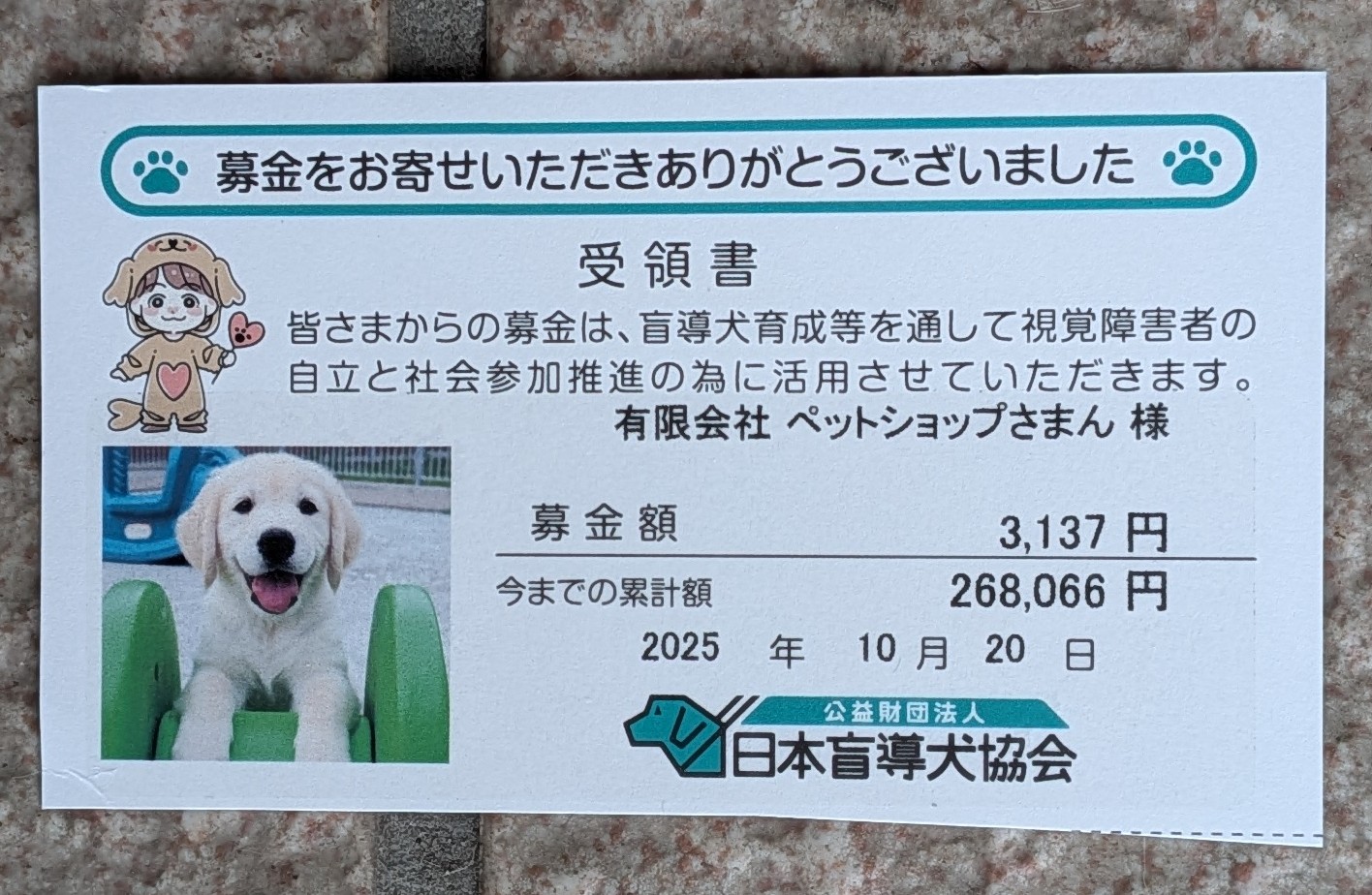 盲導犬へ寄付させていただきました!